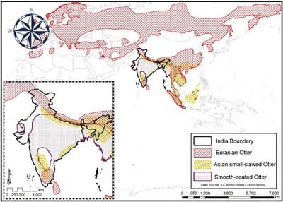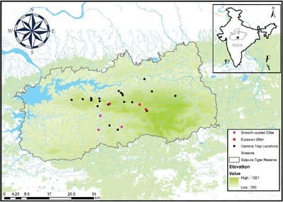 IUCN रेड लिस्ट के अनुसार तीन ऊदबिलाव प्रजातियों का वैश्विक वितरण (ऊपर बाएँ), जिसमें केंद्रीय भारतीय परिदृश्य में युरेशियन ऊदबिलाव (सबसे ऊपर) की अनुपस्थिति दर्शाई गई है। WCT अध्ययन से सतपुड़ा टाइगर रिजर्व, मध्य प्रदेश में युरेशियन ऊदबिलाव की उपस्थिति उच्च ऊंचाई (550 मीटर से ऊपर) पर लाल बिंदुओं के रूप में और स्मूद-कॉटेड ऊदबिलाव की उपस्थिति 500 मीटर से नीचे के इलाकों में गुलाबी बिंदुओं द्वारा दर्शाई गई है (ऊपर दाएँ)।